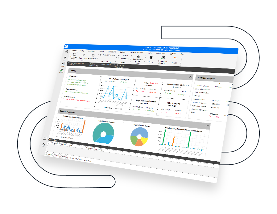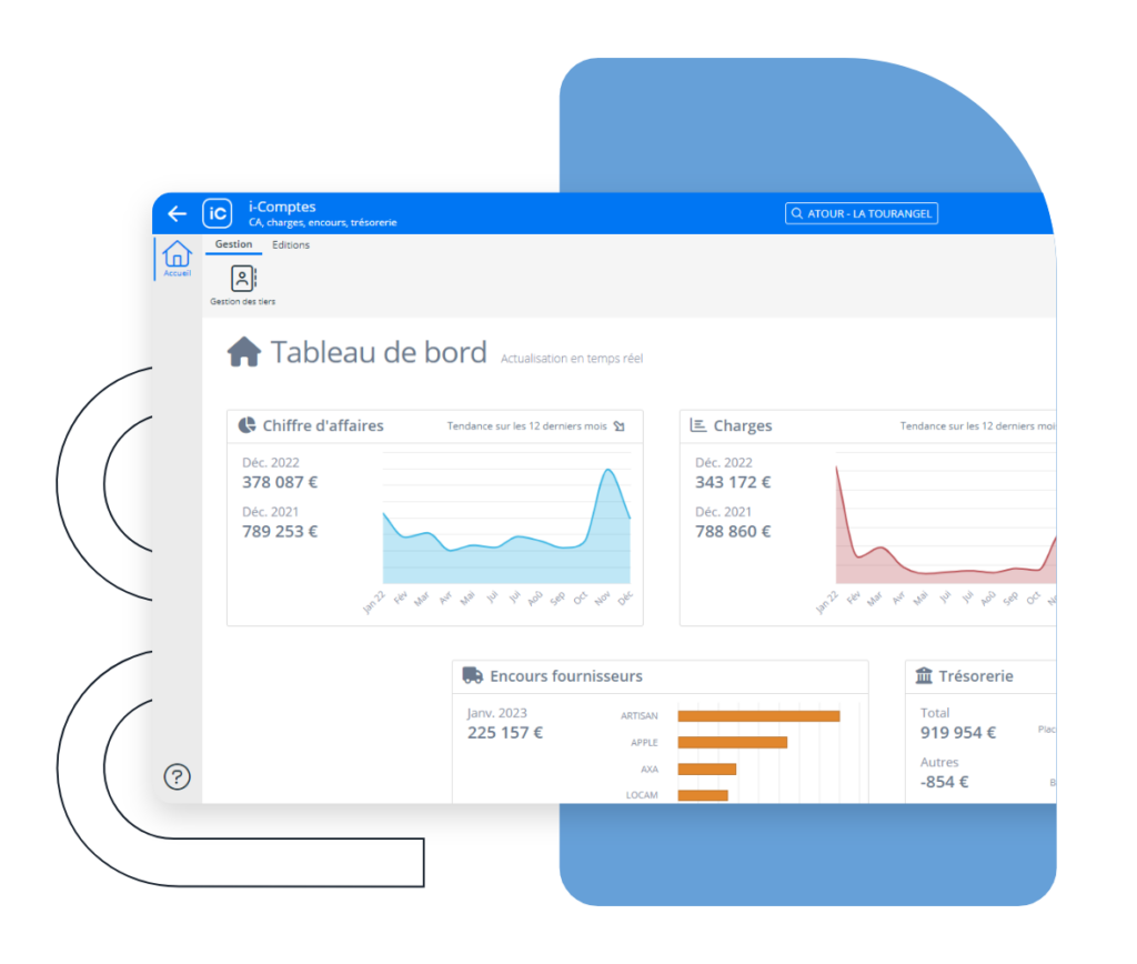 - Consulter vos principaux indicateurs : évolution du chiffre d’affaires, charges, encours clients, dettes fournisseurs, trésorerie